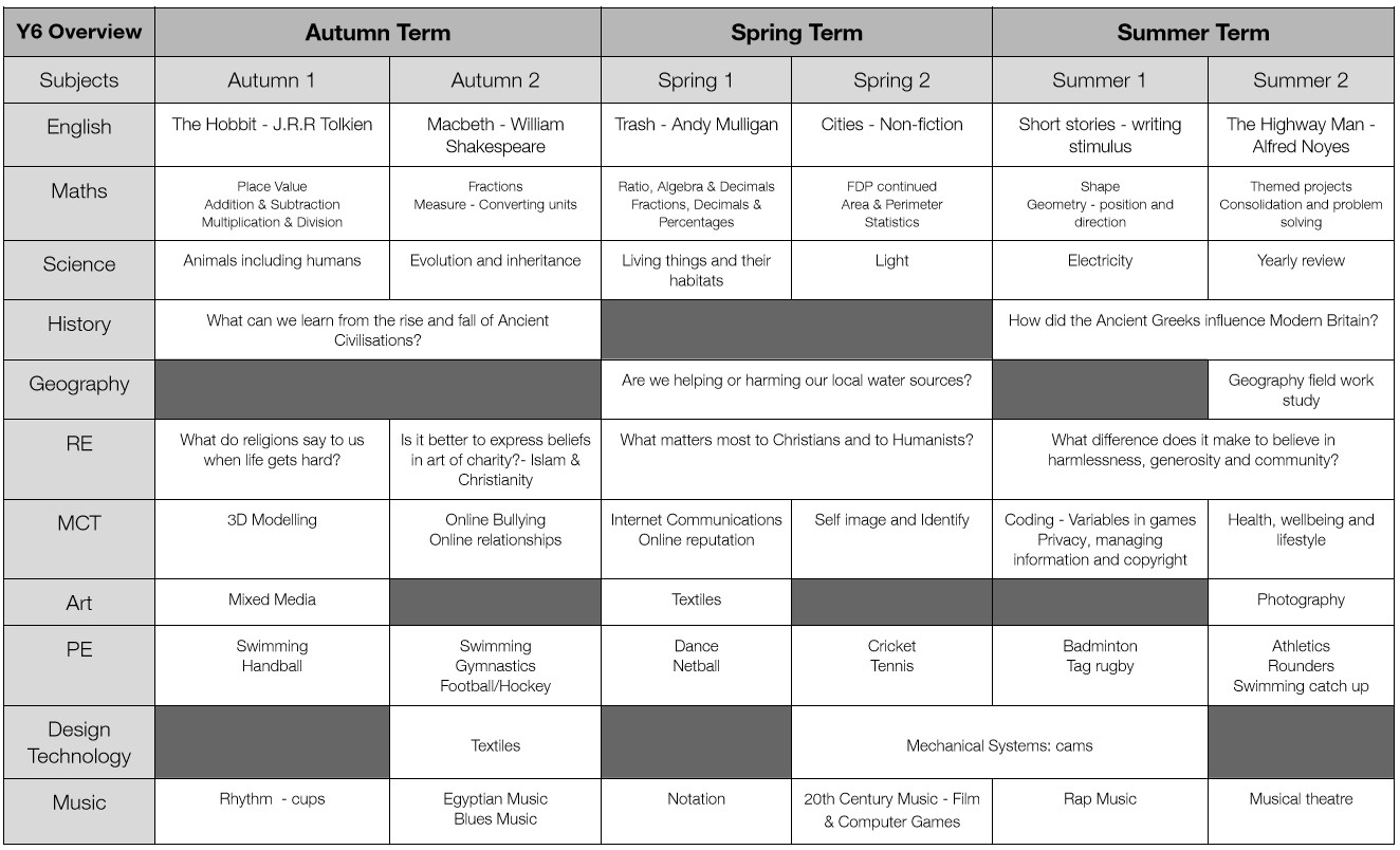 In year 6, as part of their English teaching the children will read: The Hobbit, Macbeth, Trash and The Highway Man alongside other short stories and texts. The children will analyse and explore the language and grammatical features within fiction, non-fiction, plays and poetry and will use this to support and enhance their own writing and understanding of audience and purpose. The children will complete a range of outcomes, including: narratives, non-fiction pieces, letters and diaries. Including, a setting description of the Hobbit hole, an information text on dragons, a formal letter and a narrative linked to the poem “The Highway Man”.
